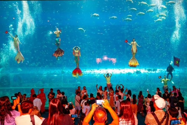 Bên cạnh đó, bạn còn có thể thưởng thức các chương trình biểu diễn đặc sắc, thú vị. Như tiết mục biểu diễn của những nàng tiên cá xinh đẹp. Hay tiết mục biểu diễn cho cá ăn sẽ được tổ chức hàng ngày tại thủy cung tuyệt đẹp này.